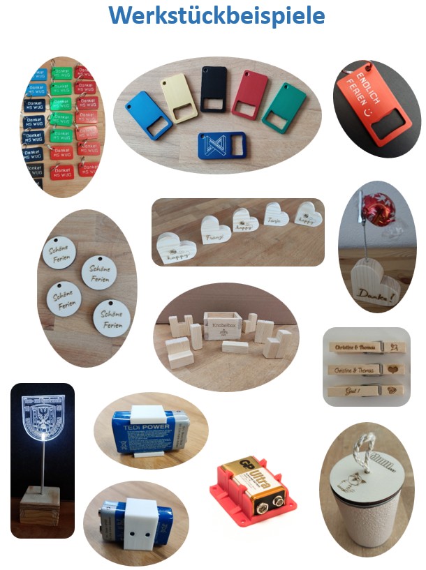 Beschriften und gestalten der Werkstücke, Herstellung präziser Bauteile aus Holz oder Acryl, z. B. Schlüsselanhänger, Modellbauteile, Werkstückteile oder individuell gestaltete Gegenstände. - 3D-Drucker: